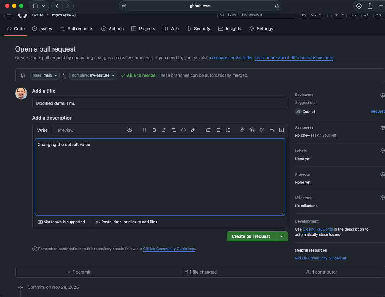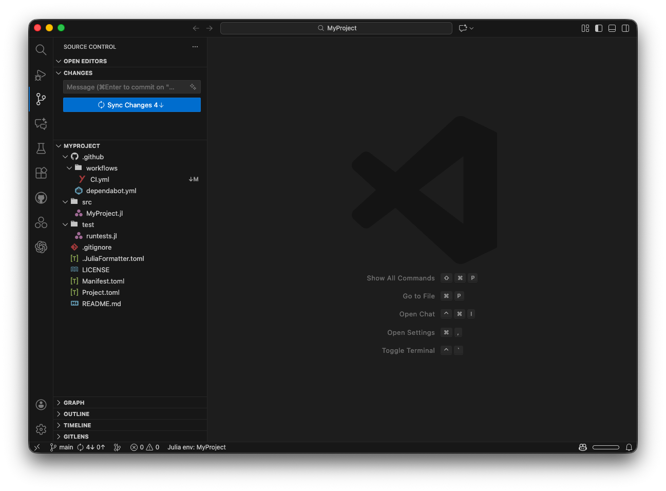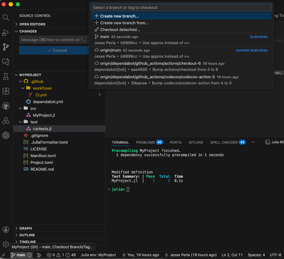 Go back to VS Code, and ensure you are in the main rather than my-feature branch. Then change the src/MyProject.jl file to add in a new function