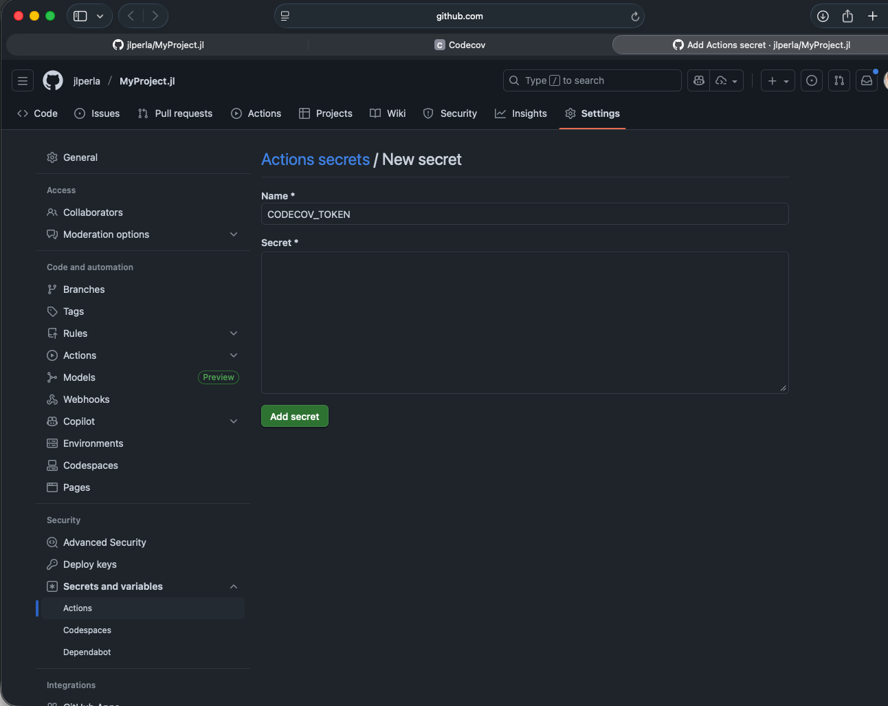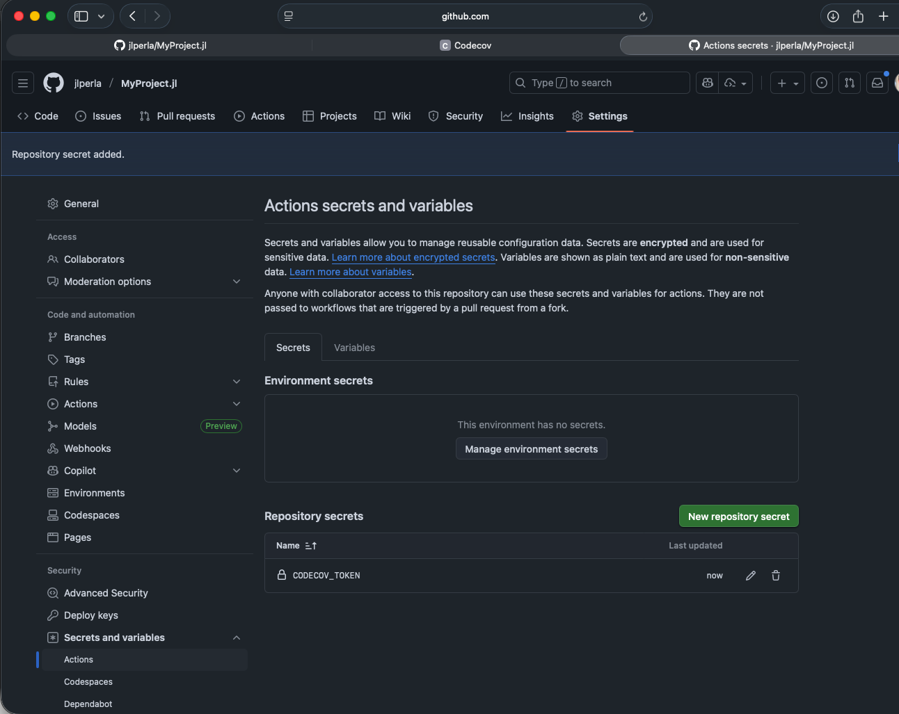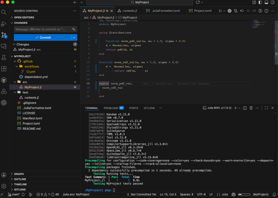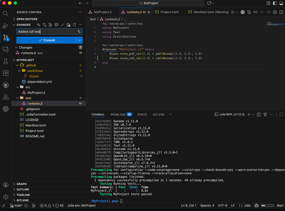 And anything else you can think of. You should be able to run ] test for the project to check that the test-suite is running, and then ensure that it is running automatically on GitHub Actions CI.
