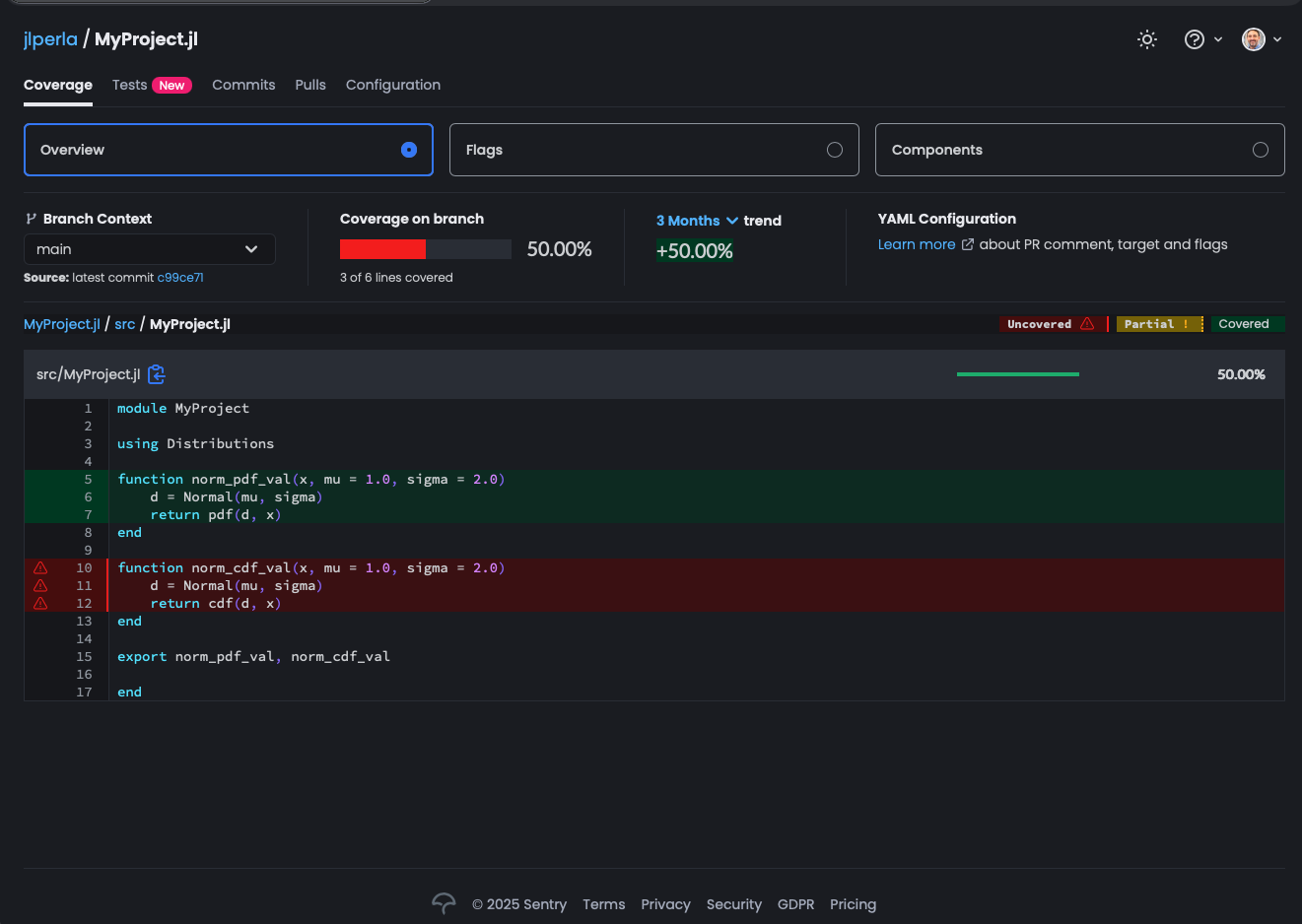 However, if you click on the code coverage badge again and look at the main branch (or that particular commit) you will see that the code coverage has only 50% coverage total.
