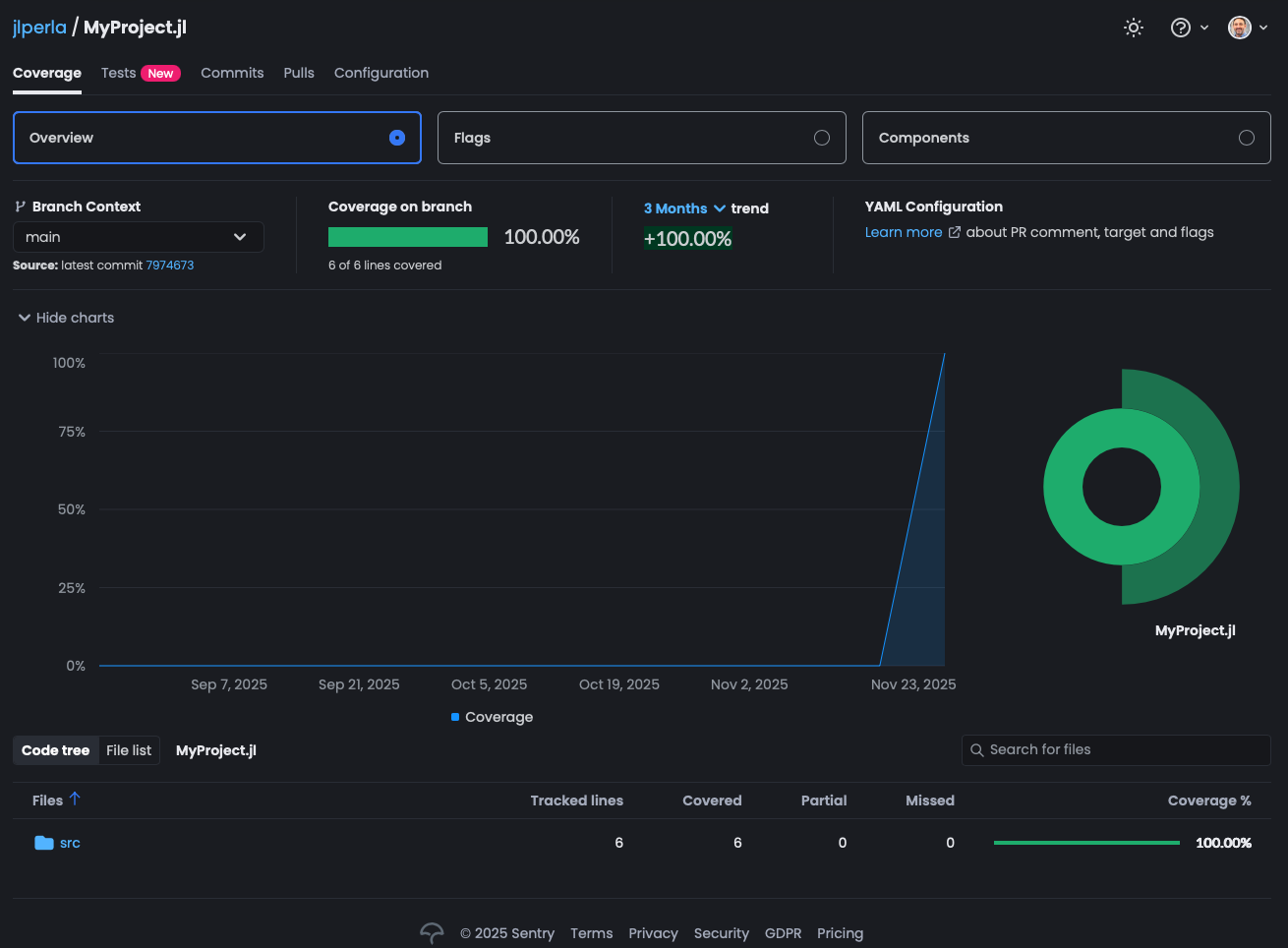 After pushing this to the server and waiting for CI to execute the unit test and the code coverage, click again on the codecov badge (which will eventually say codecov | 100% in green) to see that now all lines are covered.
