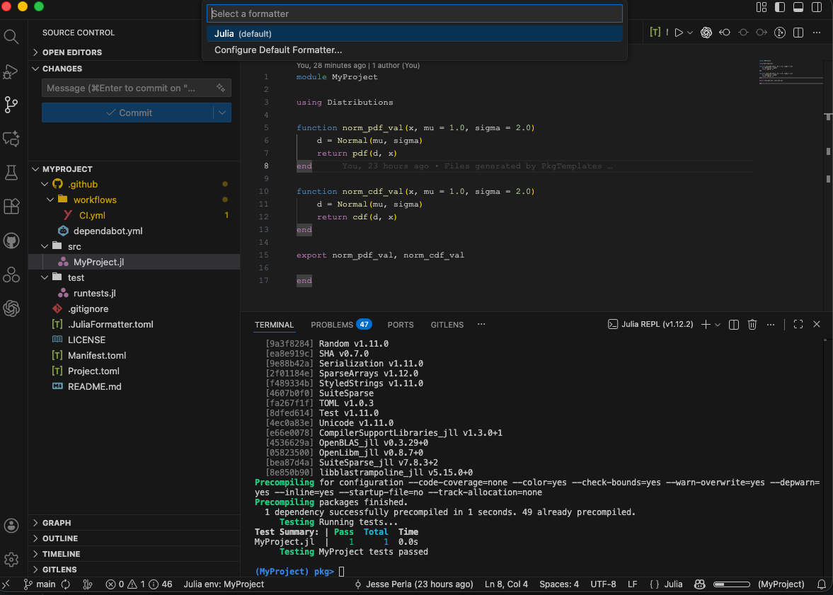 To use the formatter in VS Code with the Julia Extension, open up the src/MyProject.jl file, and then use the command palette (Ctrl+Shift+P or Cmd+Shift+P on Mac) to select Format Document. Choose Julia (default) as in