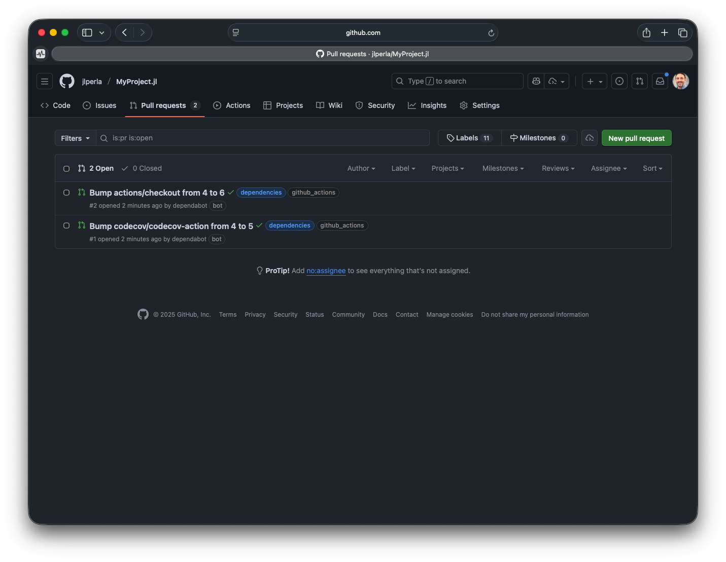 Finally, you may notice some Pull Requests have already been created, depending on the versions. These come from GitHub Actions such as CompatHelper which automatically check for updates to dependencies. For example,